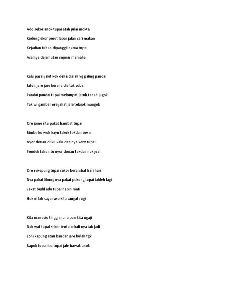 Lirik Lagu Dikir Barat Anak Tupai - Halim Yazid Ado sekor anok tupai atah julai mokte kudung ekor perut lapar jalan cari makan Kejadian tuhan dipanggil nama tupai asalnya dale hutan sejenis mamalia Kalu pasal jakit kok dehe dialah yg paling pandai jatuh jare jare kerana dia tak sobar. Lagu yang aku pilih adalah lagu tupai. Aku post lagu tapi ramai pulak tak faham.